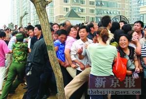 北京平均每年新建的經(jīng)濟(jì)適用房都超過300萬平方米,但這對(duì)于城里幾百萬中低收入者來說,還是顯得杯水車薪。上圖為2005年6月12日,上萬人在天通苑外排隊(duì)等待拿號(hào)購房。