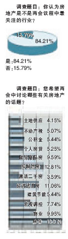 截至昨日中午12點(diǎn),共有1380位焦點(diǎn)房地產(chǎn)網(wǎng)網(wǎng)友參與調(diào)查,84.21%的網(wǎng)友表示房地產(chǎn)是兩會(huì)議程中最受關(guān)注的行業(yè)。而在網(wǎng)友最關(guān)心的問題中,房價(jià)、抑制炒房、經(jīng)濟(jì)適用房問題則高居前三位。