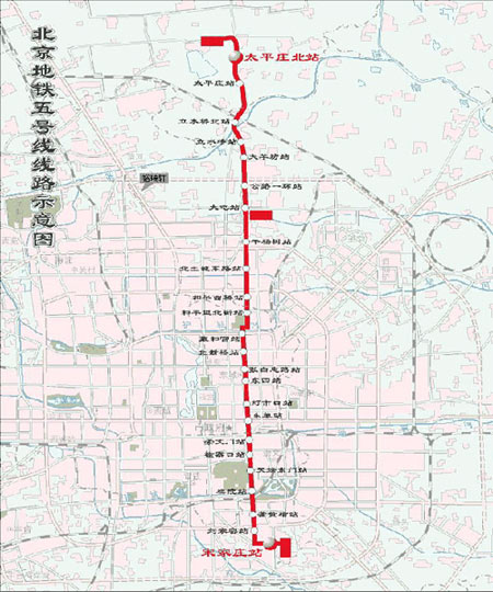 北京地鐵5號線北起昌平區(qū)境內(nèi)的東三旗,南至豐臺區(qū)的宋家莊,全長27.6公里,全線設(shè)24座車站。 地鐵5號線沿線共設(shè)24座車站,初步設(shè)置自北向南依次為:太平莊北站、太平莊站、立水橋北站、立水橋站、大羊坊站、公路一環(huán)站、大屯站、干楊樹站、北土城東路站、和平西橋站、和平里北街站、雍和宮站、北新橋站、張自忠路站、東四站、燈市口站、東單站、崇文門站、磁器口站、天壇東門站、棋院站、蒲黃榆站、劉家窯站、宋家莊站。